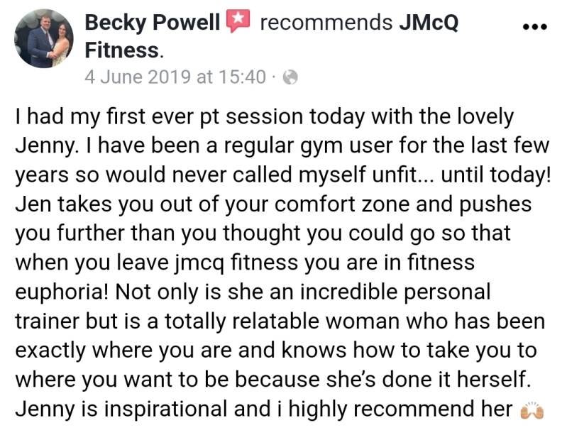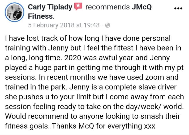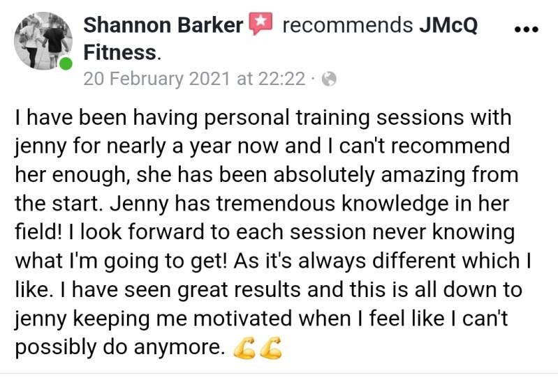 Many clients over the years have enjoyed working with JMcQ Fitness because of the personalised workout plans and nutritional advice. Time is taken to understand each individual's needs and create a plan that works for them. Impressive results speak for themselves, and my clients appreciate the care and attention they receive.